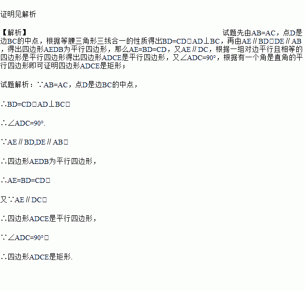 如图,在△ABC中,AB = AC,点D是边BC的中点,过点A、D分别作BC与AB的平行线,相交于点E,连结EC、AD.
