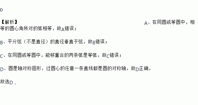 D 【解析】A、在同圆或等圆中,相等的圆心角所对的弧相等,故A错误; B、平分弦(不是直径)的直径垂直于弦,故B错误; C、在同圆或等圆中,能够重合的两条弧是等弧,故C错误; D、圆是轴对称图形,过圆心的任意一条直线都是圆的对称轴,故D正确, 故选D.
