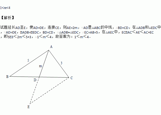 △ABC中,AB=5,AC=3,AD是△ABC的中线,设AD长为m,则m的取值范围是____.