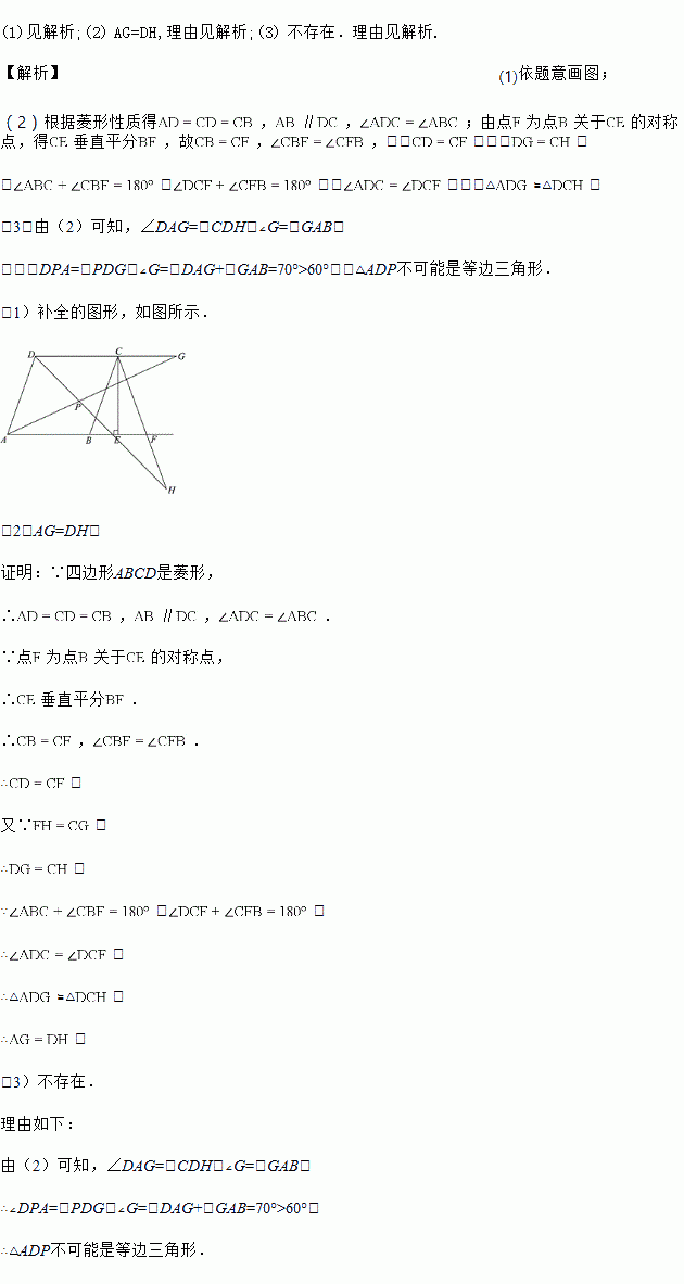 (3)若∠DAB=70°,是否存在点G,使得△ADP为等边三角形?若存在,求出CG的长;若不存在,说明理由.