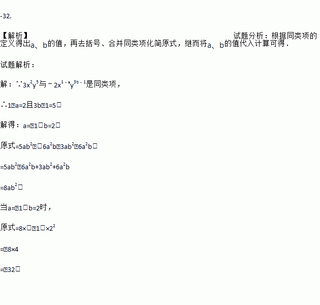 若单项式3x2y5与﹣2x1﹣ay3b﹣1是同类项,求下面代数式的值:5ab2﹣[6a2b﹣3(ab2+2a2b)].