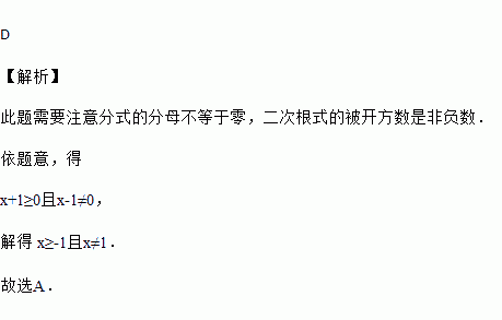 A. x>﹣1且x≠1 B. x≥﹣1 C. x≠1 D. x≥﹣1且x≠1