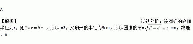 A 【解析】试题分析:设圆锥的底面半径为r,则,所以r=3,又扇形的半径为5cm,所以圆锥的高=cm,故选:A.