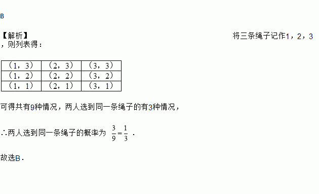 如图,有三根绳子穿过一片木板,姐妹两人分别站在木板的左、右两边,各选择该边的一根绳子.若每边每根绳子被选中的机会相等,则两人选到同一根绳子的概率为 ( )