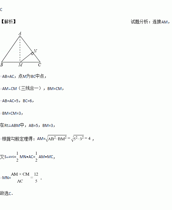 如图,在△ABC中,AB=AC=5,BC=6,点M为BC的中点,MN⊥AC于点N,则MN等于( )