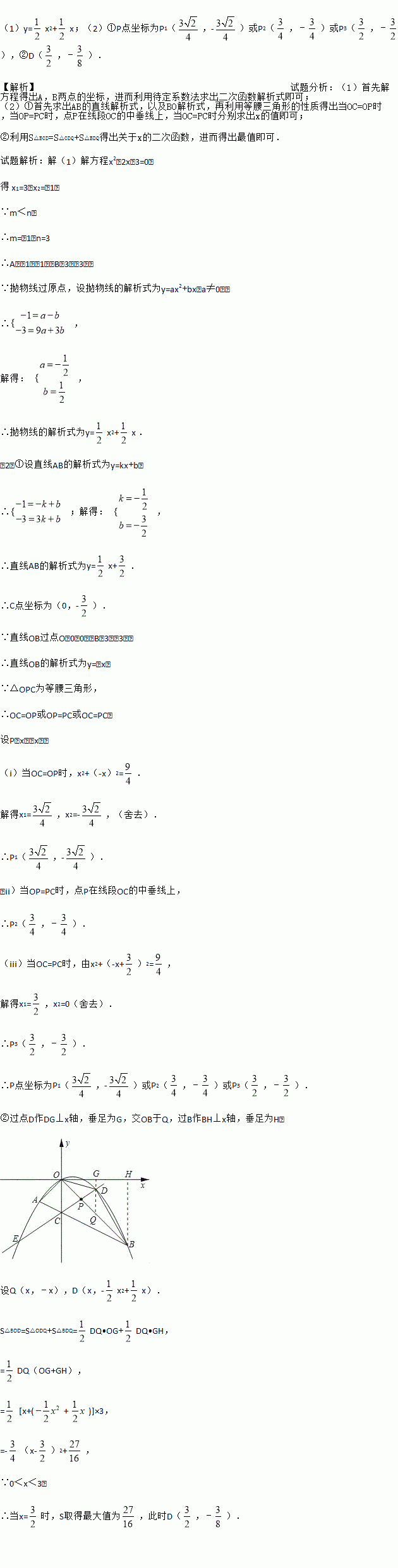 如图,在平面直角坐标系中,点A的坐标为(m,m),点B的坐标为(n,﹣n),抛物线经过A、O、B三点,连接OA、OB、AB,线段AB交y轴于点C.已知实数m、n(m<n)分别是方程x2﹣2x﹣3=0的两根.