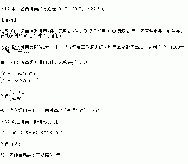 (2)商场第二次以原进价购进甲、乙两种商品,且购进甲、乙商品的数量分别与第一次相同,甲种商品按原售价出售,而乙种商品降价销售,要使第二次购进的两种商品全部售出后,获利不少于1800元,乙种商品最多可以降价多少元?