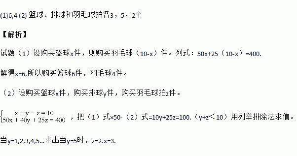 (2)若400元全部用来购买篮球、排球和羽毛球拍三种共10件,能实现吗?(若能实现直接写出一种答案即可,若不能请说明理由.)