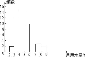 (2)如果家庭月均用水量“大于或等于4t且小于7t”为中等用水量家庭,请你估计总体小王所居住的小区中等用水量家庭大约有多少户?