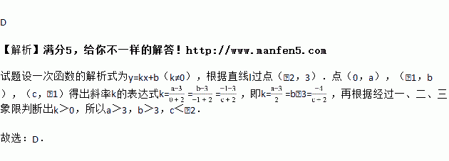 (2015丽水)在平面直角坐标系中,过点(﹣2,3)的直线l经过一、二、三象限,若点(0,a),(﹣1,b),(c,﹣1)都在直线l上,则下列判断正确的是( )
