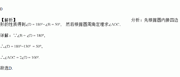 如图,四边形ABCD内接于⊙O,若∠B=130°,则∠AOC的大小是( )