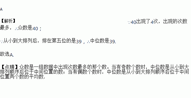某小组9位同学的中考体育测试成绩(满分40分)依次为37,40,39,37,40,38,40,39,40. 则这组数据的众数与中位数分别是( )