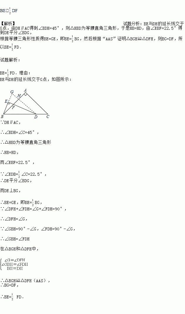 如图,△ABC中,AB=AC,∠BAC=90°,点D在线段BC上,∠EDB=∠C,BE⊥DE,垂足为E,DE与AB相交于点F.试探究线段BE与DF的数量关系,并证明你的结论.