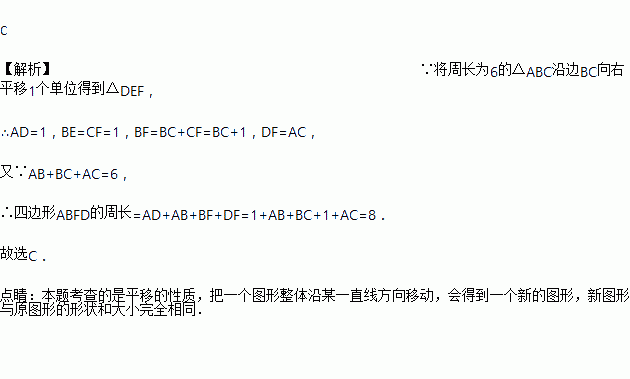 如图,将周长为6的△ABC沿BC方向向右平移1个单位得到△DEF,则四边形ABFD的周长为( )