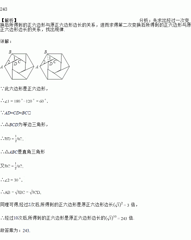 如图,把正六边形各边按同一方向延长,使延长的线段与原正六边形的边长相等,顺次连接这六条线段外端点可以得到一个新的正六边形,重复上述过程,经过10次后,所得到的正六边形是原正六边形边长的_____倍.
