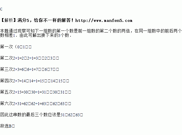 一列数:0,1,2,3,6,7,14,15,30,____,____,____,____这串数是由小新按照一定规则写下来的,他第一次写下“0,1”,第二次接着写“2,3”,第三次接着写“6,7”,第四次接着写“14,15”,就这样一直接着往下写,那么这列数的后面三个数应该是下面的( )