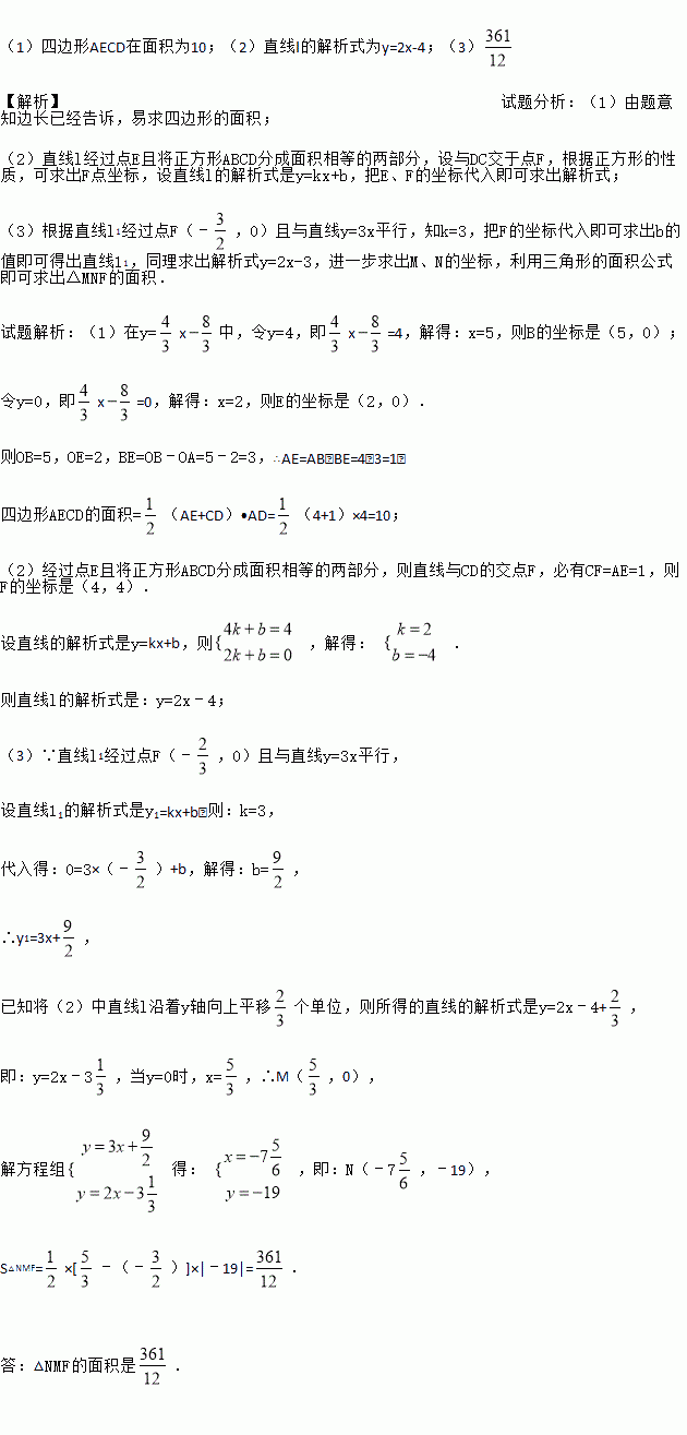(2)若直线l经过点E,且将正方形ABCD分成面积相等的两部分,求直线l的解析式;