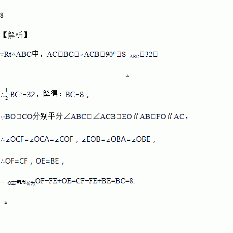 Rt△ABC中,AC=BC,∠ACB=90°,如图,BO、CO分别平分∠ABC、∠ACB,EO∥AB,FO∥AC,若S△ABC=32,则△OEF的周长为________.