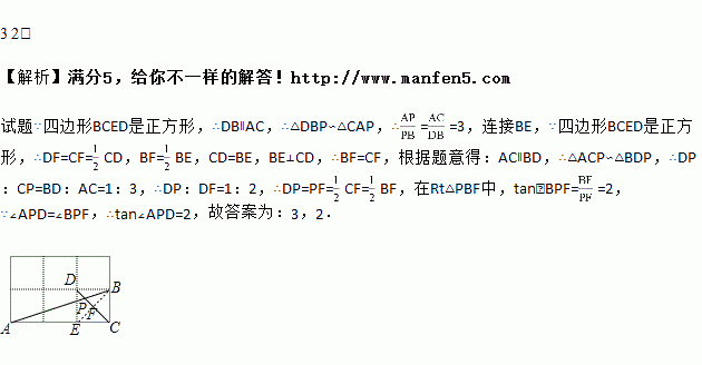 (2016四川省自贡市)如图,在边长相同的小正方形网格中,点A、B、C、D都在这些小正方形的顶点上,AB,CD相交于点P,则的值=______,tan∠APD的值=______.