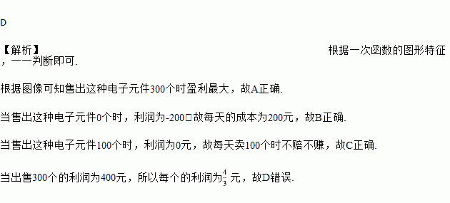 某批发部对经销的一种电子元件调查后发现,一天的盈利y(元)与这天的销售量x(个)之间的函数关系的图像如图所示下列说法不正确的是( ).