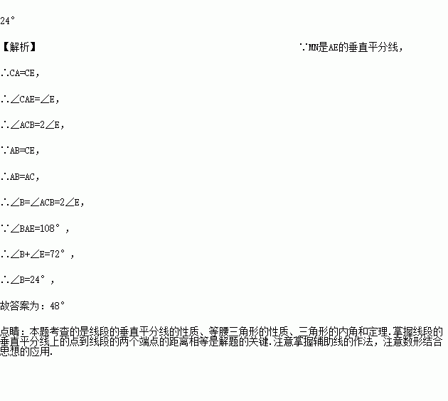 如图,在△ABE中,∠BAE=108°,AE的垂直平分线MN交BE于点C,且AB=CE,则∠B的度数是____.