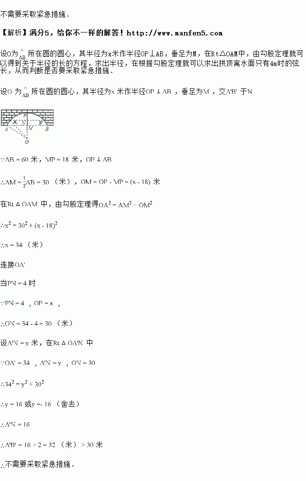 如图,有一个拱桥是圆弧形,它的跨度为,拱高为,当洪水泛滥跨度小于时,要采取紧急措施.若拱顶离水面只有时,问是否要采取紧急措施?