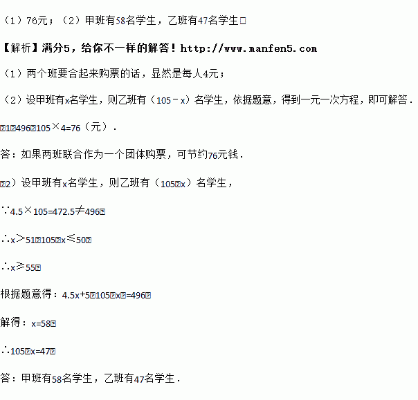 某校初一甲、乙两班共105人去游主题公园,如果两班都以班为单位分别购票,则一共需付496元.