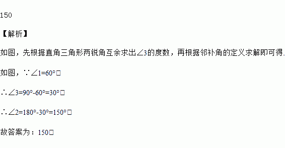 把一块直尺与一块三角板如图放置,若∠1=60°,则∠2=_______°.