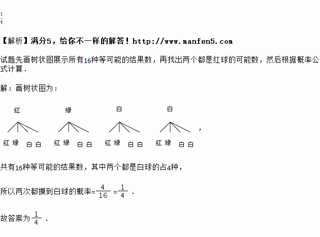 一个盒子内装有只有颜色不同的四个球,其中红球1个、绿球1个、白球2个,小明摸出一个球放回,再摸出一个球,则两次都摸到白球的概率是 .