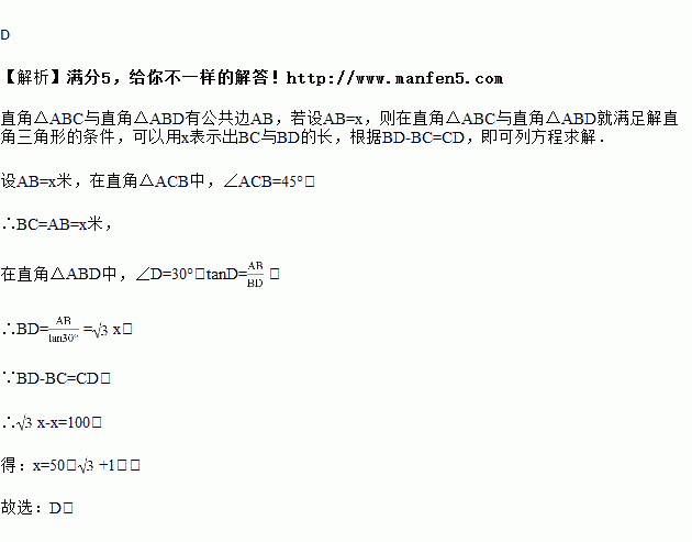 如图,从山顶望地面、两点,测得它们的俯角分别为和,已知米,点在上,则山高( )