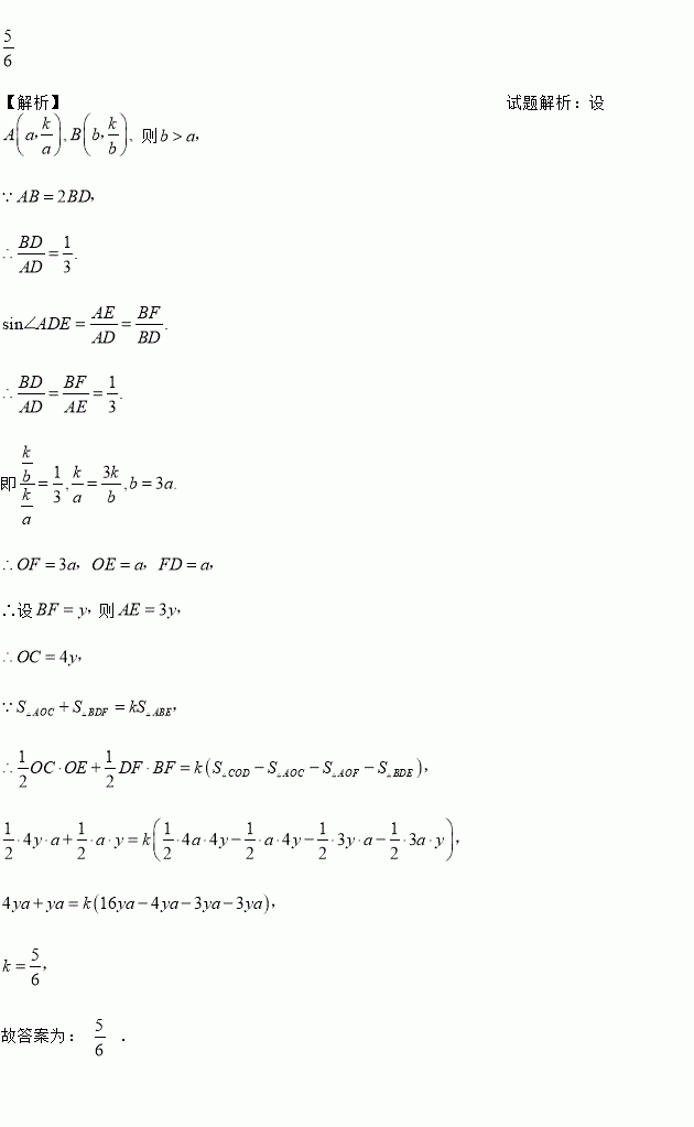 (k>0,x>0)的图象上(点A在点B的左侧),直线AB分别交x轴,y轴于点D,C,AE⊥x轴于点E,BF⊥x轴于点F,连结AO,BE,已知AB=2BD,△AOC与△BDF的面积之和是△ABE的面积的k倍,则k的值是_____.