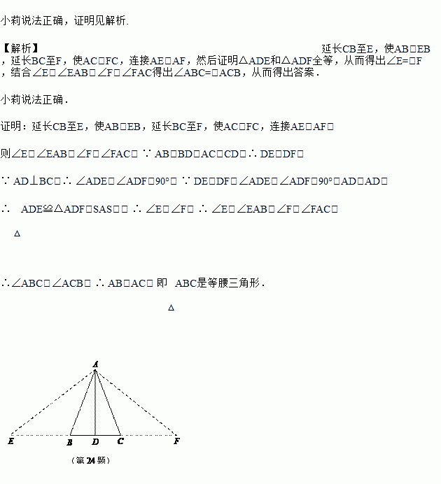 如图,△ABC中,AD⊥BC,垂足是D.小莉说:当AB+BD=AC+CD时,则△ABC是等腰三角形.她的说法正确吗,如正确,请证明;如不正确,请举反例说明.