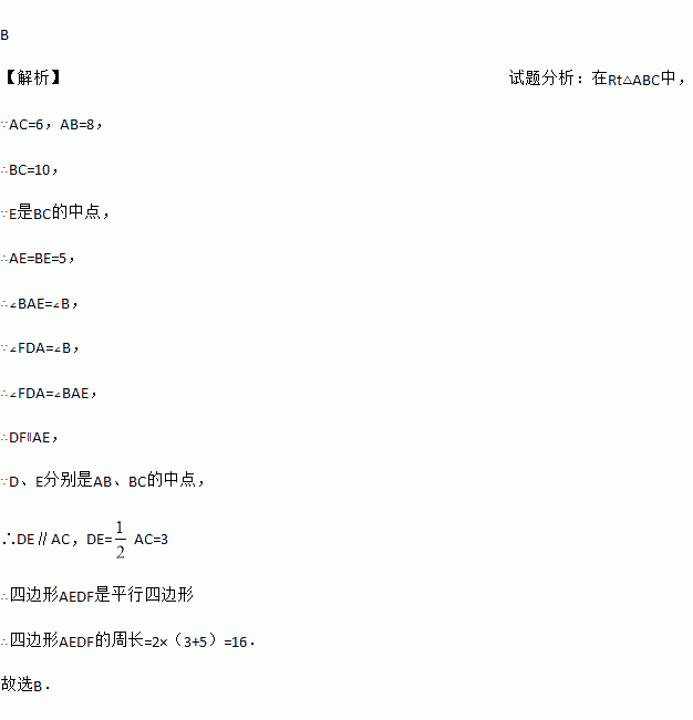 如图,在Rt△ABC中,∠BAC=90°,D、E分别是AB、BC的中点,F在CA的延长线上,∠FDA=∠B,AC=6,AB=8,则四边形AEDF的周长为( )