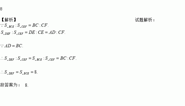 ABCD中,点E在CD边上运动(不与C,D两点重合),连结AE并延长与BC的延长线交于点F.连结BE,DF,若△BCE的面积为8,则△DEF的面积为________.