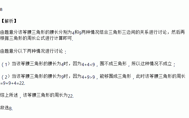等腰三角形的两边长分别为4和9,则它的周长 ( )