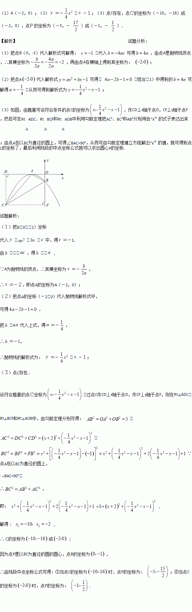 (3)在抛物线上是否存在一点C,使以BC为直径的圆经过抛物线的顶点A?若不存在请说明理由;若存在,求出点C的坐标,并求出此时圆的圆心点P的坐标。