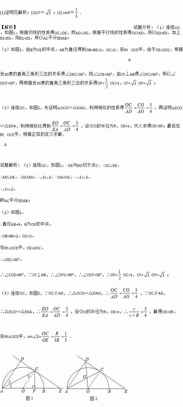Èçͼ¢Ù£¬ABΪ°ëÔ²µÄÖ±¾¶£¬OΪԲÐÄ£¬CΪԲ»¡ÉÏÒ»µã£¬AD´¹Ö±ÓÚ¹ýCµãµÄÇÐÏߣ¬´¹×ãΪD£¬ABµÄÑÓ³¤Ïß½»Ö±ÏßCDÓÚµãE.
