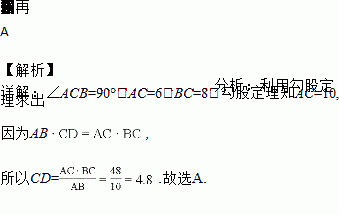 如图, 中,∠ACB=90°,CD⊥AB于点D,AC=6,BC=8,则CD的长为( )