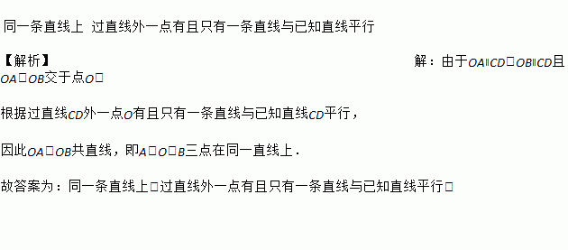 如图所示,已知OA∥CD,OB∥CD,那么A、O、B三点在__________,理由是____________________.