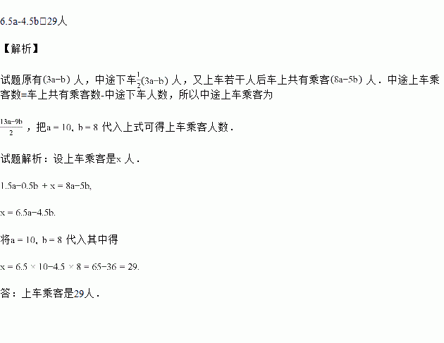 大客车上原有(3a-b)人,中途下去一半人,又上车若干人,使车上共有乘客(8a-5b)人,问中途上车乘客是多少人?当a=10,b=8时,上车乘客是多少人?