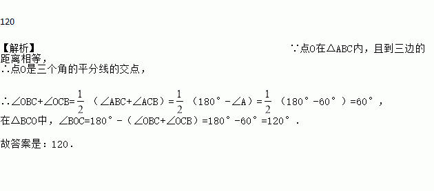 如图,点O在△ABC内,且到三边的距离相等.若∠A=60°,则∠BOC=________°.
