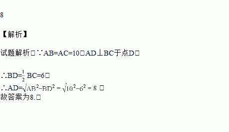 如图,在△ABC中,AB=AC=10,BC=12,AD⊥BC于点D,则AD的长为_______.