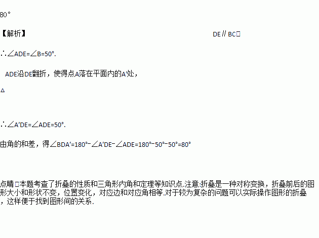 如图,△ABC中,DE∥BC,将△ADE沿DE翻折,使得点A落在平面内的A′处,若∠B=50°,则∠BDA′的度数是______.