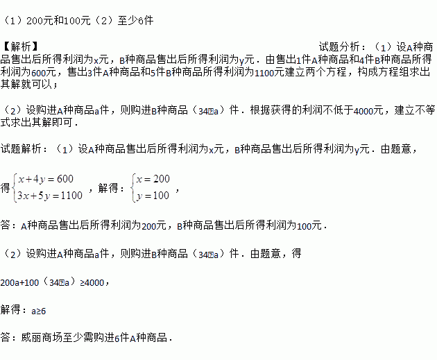 (1)200元和100元(2)至少6件 【解析】试题分析:(1)设A种商品售出后所得利润为x元,B种商品售出后所得利润为y元.由售出1件A种商品和4件B种商品所得利润为600元,售出3件A种商品和5件B种商品所得利润为1100元建立两个方程,构成方程组求出其解就可以; (2)设购进A种商品a件,则购进B种商品(34﹣a)件.根据获得的利润不低于4000元,建立不等式求出其解即可. ...
