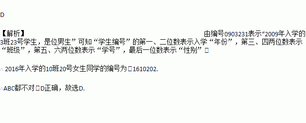 为便于管理,我校决定给每个学生编号.设定末尾用1表示男生,2表示女生.如果编号0903231表示“2009年入学的3班23号学生,是位男生”,那么2016年入学的10班20号女生同学的编号为( )