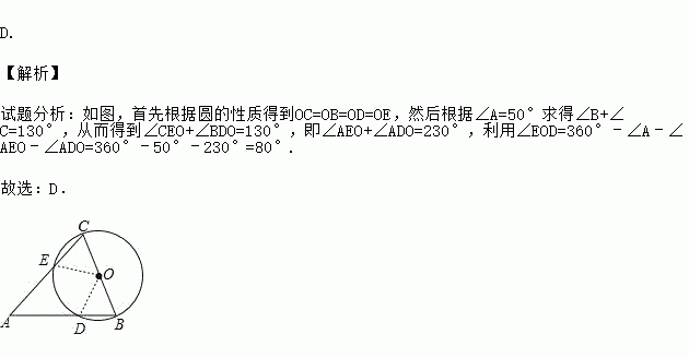 如图,△ABC中,∠A=50°,O是BC的中点,以O为圆心,OB长为半径画弧,分别交AB,AC于点D,E,连接OD,OE,测量∠DOE的度数是( ).