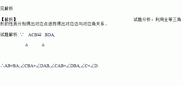 如图,△ACB与△BDA全等,AC与BD对应,BC与AD对应,写出其余的对应边和对应角.