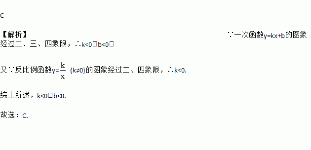 C 【解析】∵一次函数y=kx+b的图象经过二、三、四象限,∴k<0,b<0, 又∵反比例函数y=(k≠0)的图象经过二、四象限,∴k<0. 综上所述,k<0,b<0. 故选:C.