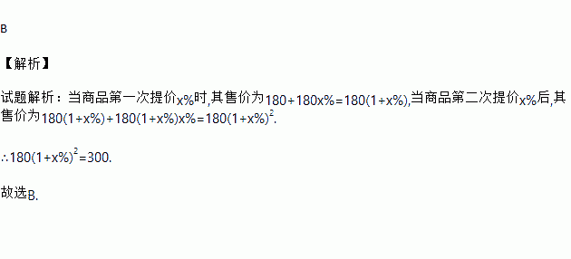 A. 180(1+x%)=300 B. 180(1+x%)2=300 C. 180(1﹣x%)=300 D. 180(1﹣x%)2=300