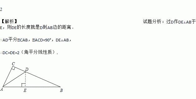 如图,在Rt△ABC中,∠C=90°,AD是∠BAC的平分线,DC=2,则D到AB边的距离是_________.